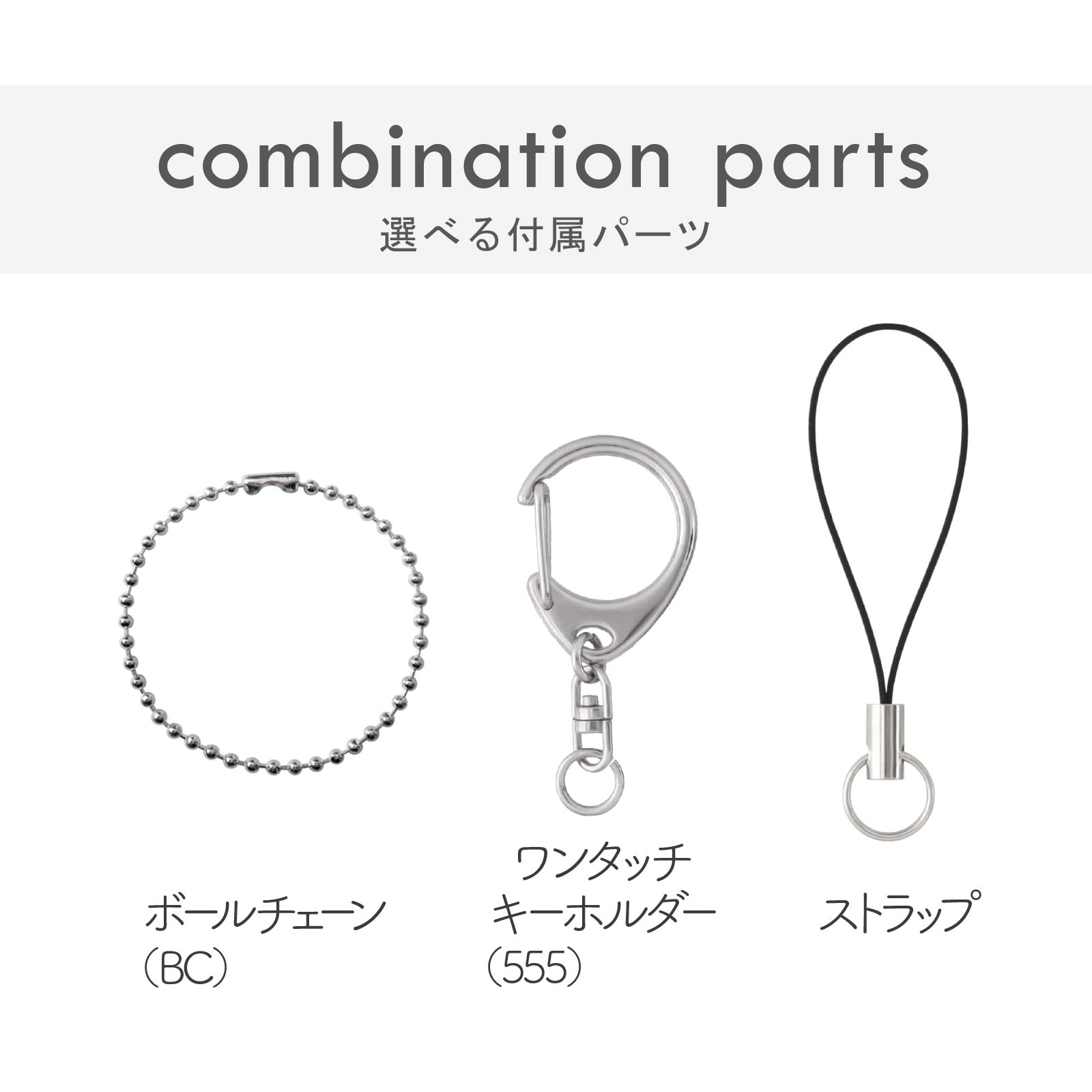 付属パーツはボールチェーン、ワンタッチキーホルダー、ストラップの