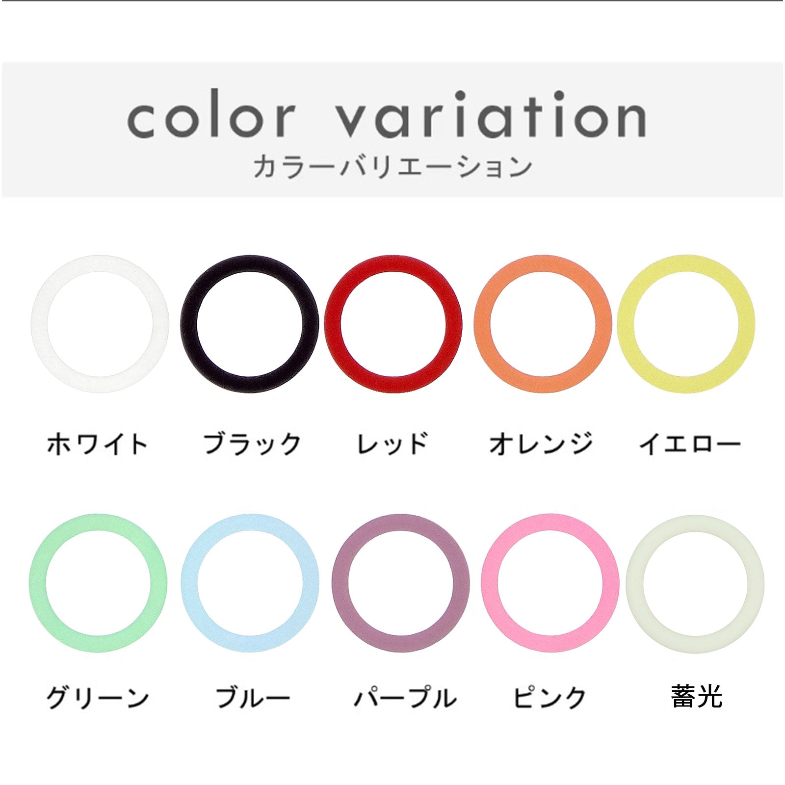 シリコン部分は豊富なカラー展開でホワイト、ブラック、レッド、オレンジ、イエロー、グリーン、ブルー、パープル、ピンク、暗闇で光る蓄光の10色からお好きなカラーを選べます。