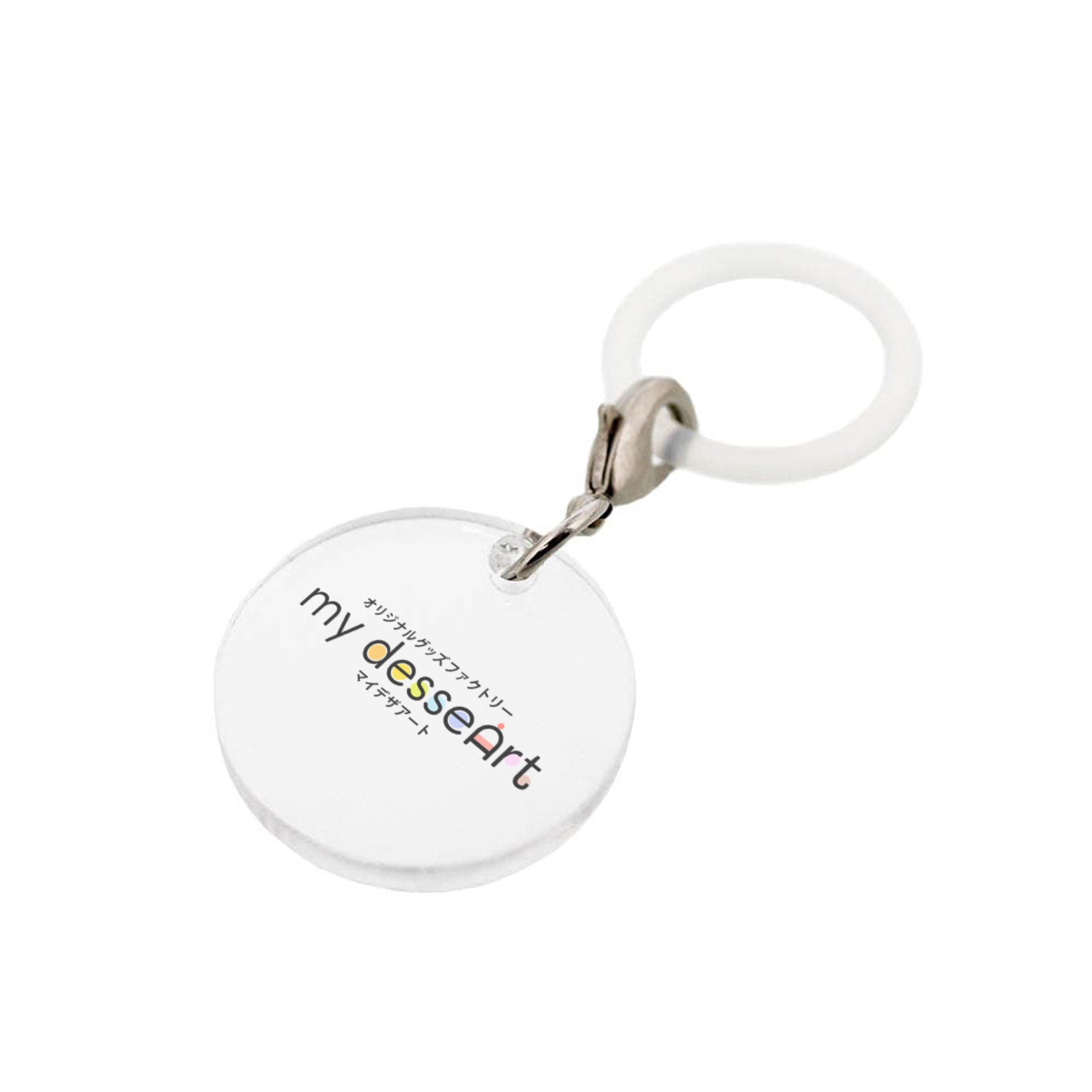 印刷プレート:アクリル、リング:シリコンゴム、カニカンフック:真鍮、丸カン:鉄